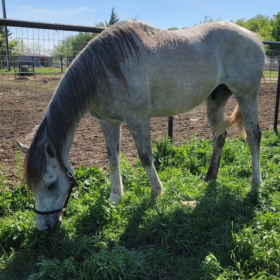 Iceman is a 2017, racing bred thoroughbred who although tattoed and registered with The Jockey Club as Ice Box Time, never actually raced. He was born with bi-lateral laryngeal hemiplegia, or occlusion of his airway on both sides. We believe this is likely the reason that although he was trained and registered to race, he never actually did. We rescued Ice May 9, 2022 from an owner who was starving him and allowing an injury on his right front foot to fester. Iceman's rehabiliation has been incredibly slow and difficult, as he's rather opinionated and accident prone. Since coming to HPF, he's gained all of the weight he needed, had the injuries to his right foot repaired, severely injured and been hospitalized for his left front foot that required a cast, had tie-back surgery and vocal cordectomy to adress his breathing issues, battled crazy abscesses and numerous cuts, scrapes and bruises. Ice has a fan club he calls his Loyal Royals, as he fancies himself royalty, and is most commonly referred to as HRH Iceman Spicy Tuna. Tuna is his nickname as when he is healthy he is a very spicy character and keeps us all laughing. Iceman publishes a diary entry weekly since his 3 month stall rest, and can almost always be counted on for a good chuckle. Iceman is intended to be fully rehabilitated, trained and adopted out to a wonderful family. If he can ever remain healthy long enough for all of that to happen that is.